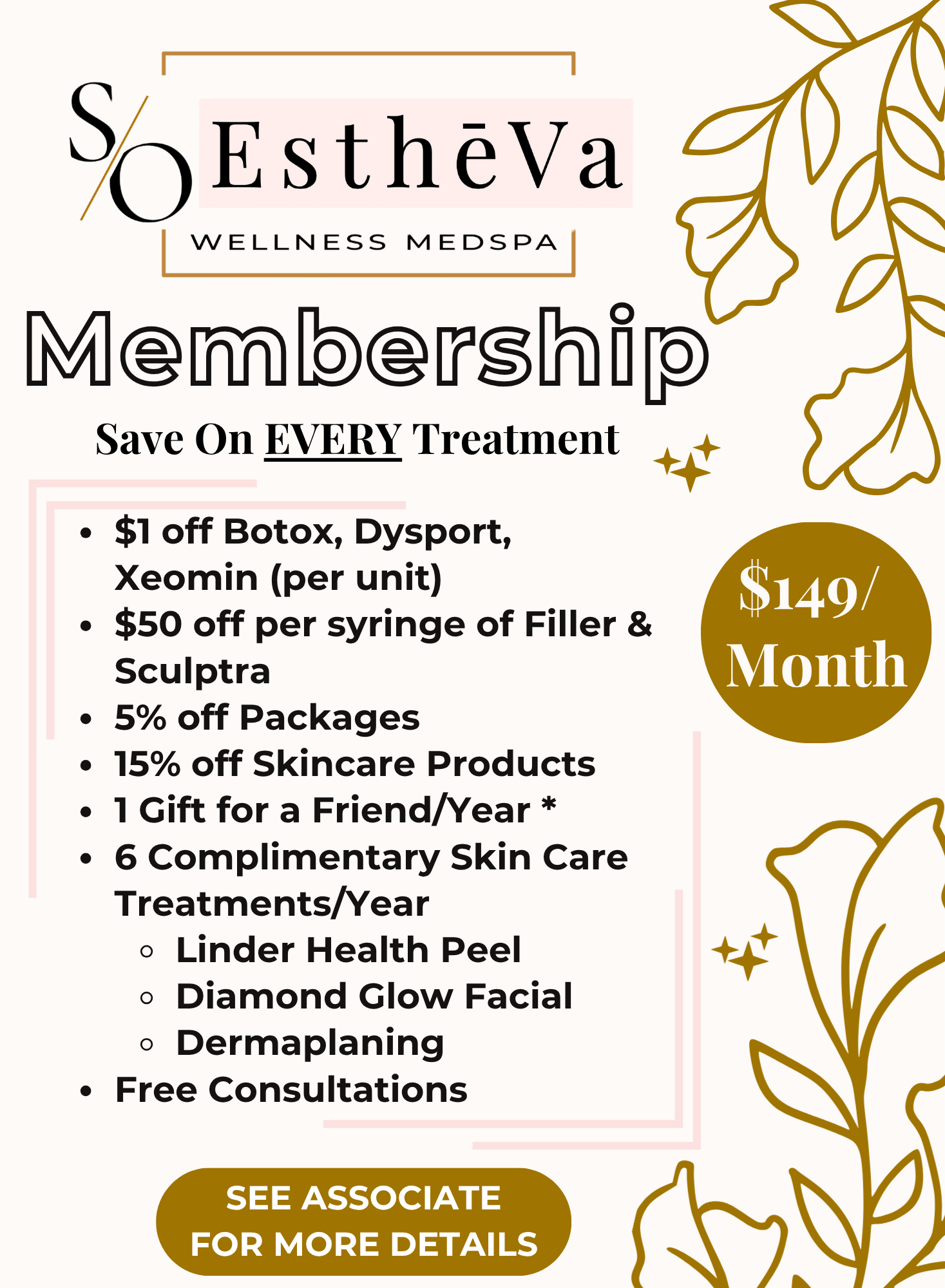 - Memberships are non-transferable between patients and can only be used at SO EsthēVa Wellness MedSpa.